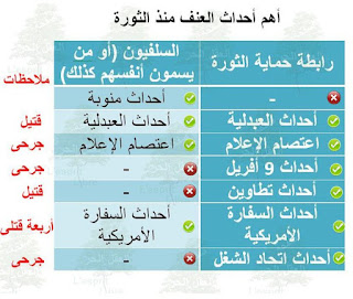 المهم، فإن مهمة هذه الرابطة، اللي جايبتها ثورية وأزلام وتجمع وهات من هاك اللاوي، مهمتها هي الدفاع عن النهضة بطريقة ميلشوية، مختبئة خلف العمل الجمعياتي من ناحية، وخلف الشعار الثوري من ناحية أخرى، وكي نقولو عمل ميلشوي فإنو يعني "العنف" فكل حادثة عنف حدثت في تونس منذ الثورة نجد خلفها إمّا هذه الرابطة وإما من يسمون أنفسهم سلفيين، وهذا جدول توضيحي فيه مشاركة هذه الروابط في كلّ أحداث العنف تقريبا